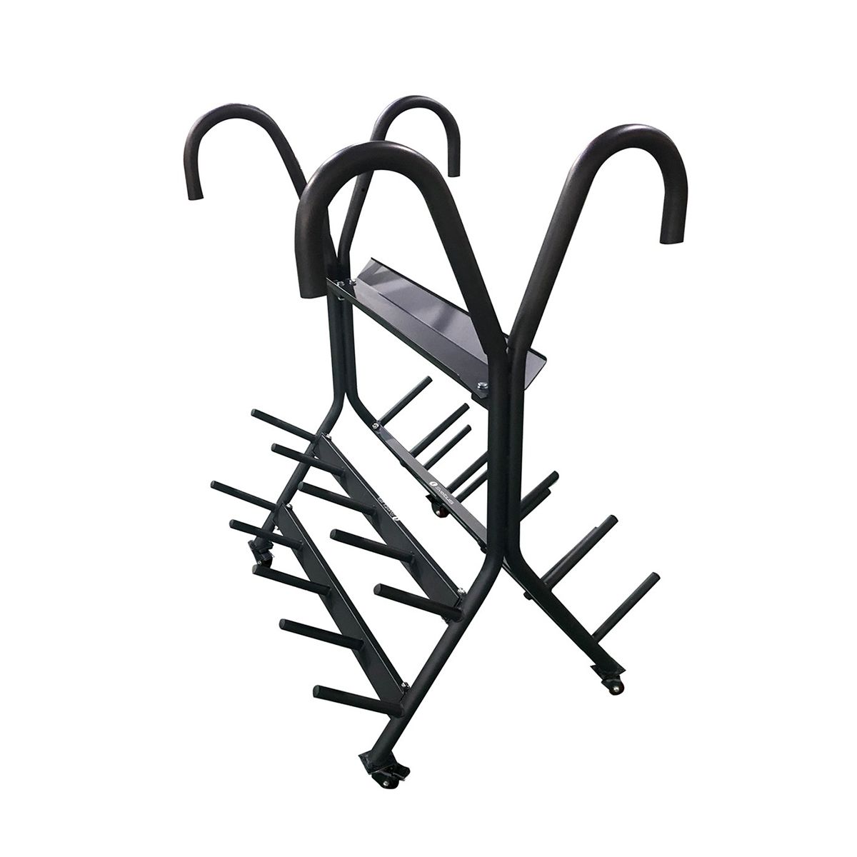 20 db tárcsatartó tüske segítségével átláthatóan és helytakarékosan tárolható a 28 mm átmérőjű súlyok. Az erős fémszerkezet görgős mechanikával rendelkezik.